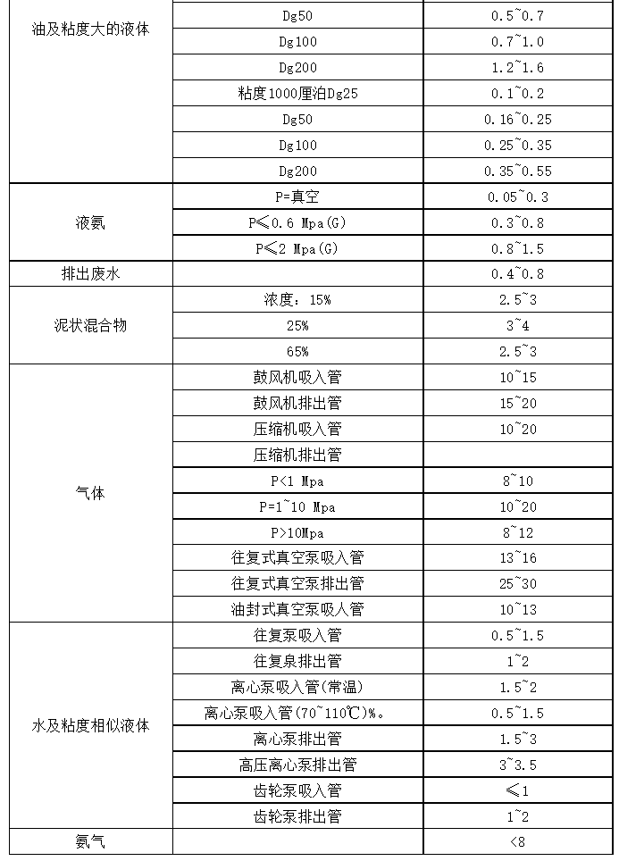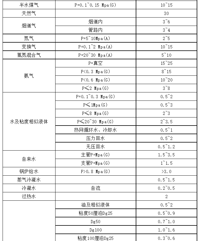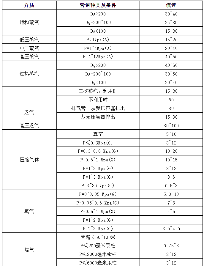 不同介質(zhì)在管道中的流速表是圖片形式的,難以辨別,本文將以表格形式列出此表。
