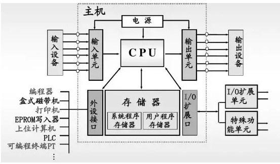 然后還有輸入輸出單元以及I/O擴(kuò)展接口,這些是負(fù)責(zé)和外部設(shè)備連接的。后還有一個(gè)電源模塊,將外部的輸入電源經(jīng)過處理后,轉(zhuǎn)化成PLC的CPU、存儲(chǔ)器、輸入輸出接口等內(nèi)部電路工作所需要的直流電源,例如24V。