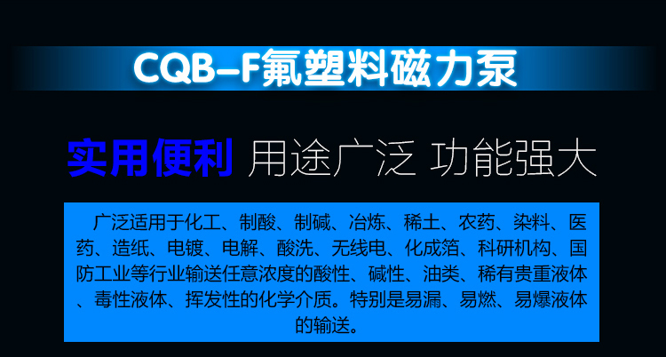 CQB-F氟塑料磁力泵俗稱磁力驅(qū)動泵,其中金屬材質(zhì)耐腐蝕磁力泵應(yīng)用廣,非金屬材質(zhì)中氟塑料磁力泵,襯氟磁力泵其過流部件采用氟塑料及高純度工業(yè)陶瓷制成,具有優(yōu)異的耐腐性及密封性廣泛用于化工、鋁 箔、制酸、涂裝、有色金屬等行業(yè)及易揮發(fā)、有機(jī)溶劑和貴重液體的輸送。