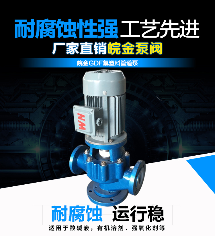 GDF氟塑料管道泵是耐腐蝕化工離心泵中的一種立式結(jié)構(gòu)形式的泵,安裝維護(hù)方便(維護(hù)葉輪、泵體、軸承時可以不拆除管道)、性能范圍廣、成熟等優(yōu)勢。耐腐蝕管道泵和耐酸堿管道泵,作為耐腐蝕泵中的氟塑料材質(zhì)泵在耐腐蝕性上的表現(xiàn),氟塑料管道泵以襯氟管道泵得到大多數(shù)工況企業(yè)的青睞。
