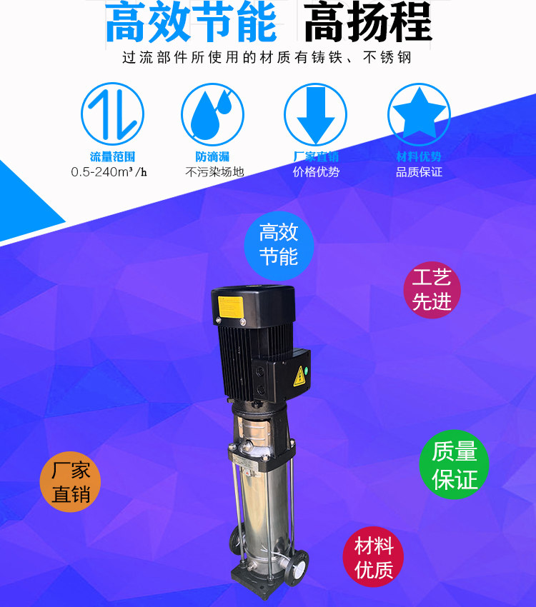 ·多級泵的進水口與出水口位于泵座同一水平線上,可直接用于管路當中。