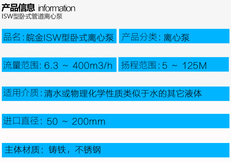 ISW臥式管道泵可以定制普通型,熱水型,防腐型,防爆型等。材質(zhì)分為:鑄鐵材質(zhì)和不銹鋼材質(zhì),軸距短,穩(wěn)定性好,維修簡便。