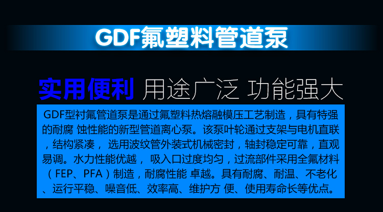 GDF氟塑料管道泵是耐腐蝕化工離心泵中的一種立式結(jié)構(gòu)形式的泵,安裝維護方便(維護葉輪、泵體、軸承時可以不拆除管道)、性能范圍廣、技術(shù)成熟等優(yōu)勢。耐腐蝕管道泵和耐酸堿管道泵,作為耐腐蝕泵中的氟塑料材質(zhì)泵在耐腐蝕性上的表現(xiàn),氟塑料管道泵以襯氟管道泵得到大多數(shù)工況企業(yè)的青睞。