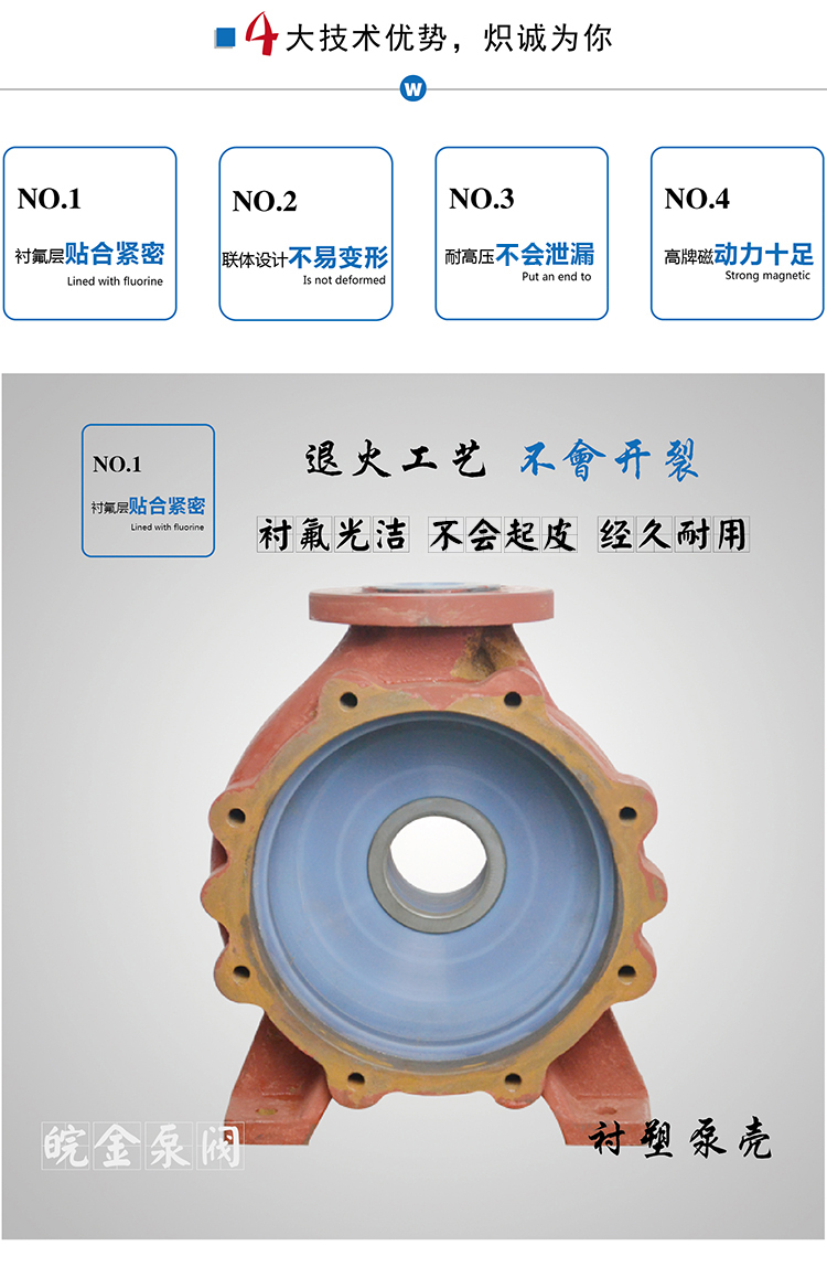 結(jié)構(gòu)與用途:過(guò)流部件采用氟塑料制造,高耐腐蝕性,泵的承重部分為金屬材料,足以承受管道和流體的重量及機(jī)械沖擊;可安全輸送強(qiáng)酸、強(qiáng)堿、有機(jī)溶劑等;適用各種化工流程,充分滿足安全性、可靠性和環(huán)保要求。